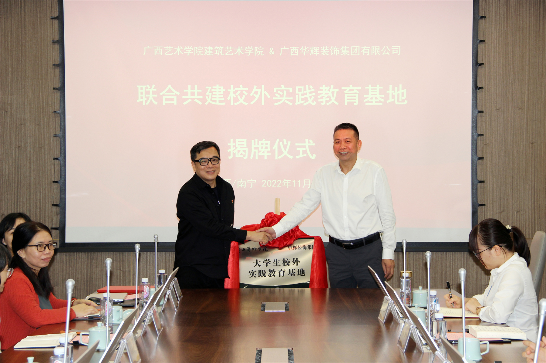 緊接著,廣西藝術(shù)學(xué)院建筑藝術(shù)學(xué)院院長(zhǎng)林海、華輝裝飾集團(tuán)董事長(zhǎng)楊景忠,共同為“聯(lián)合共建校外實(shí)踐教育基地”揭牌。