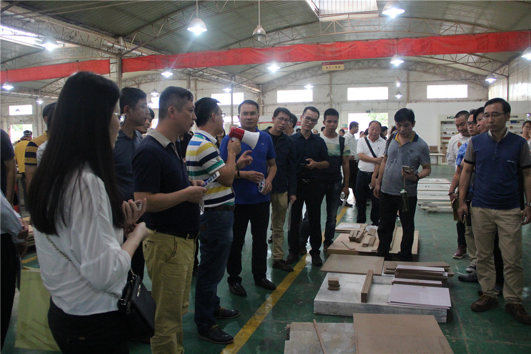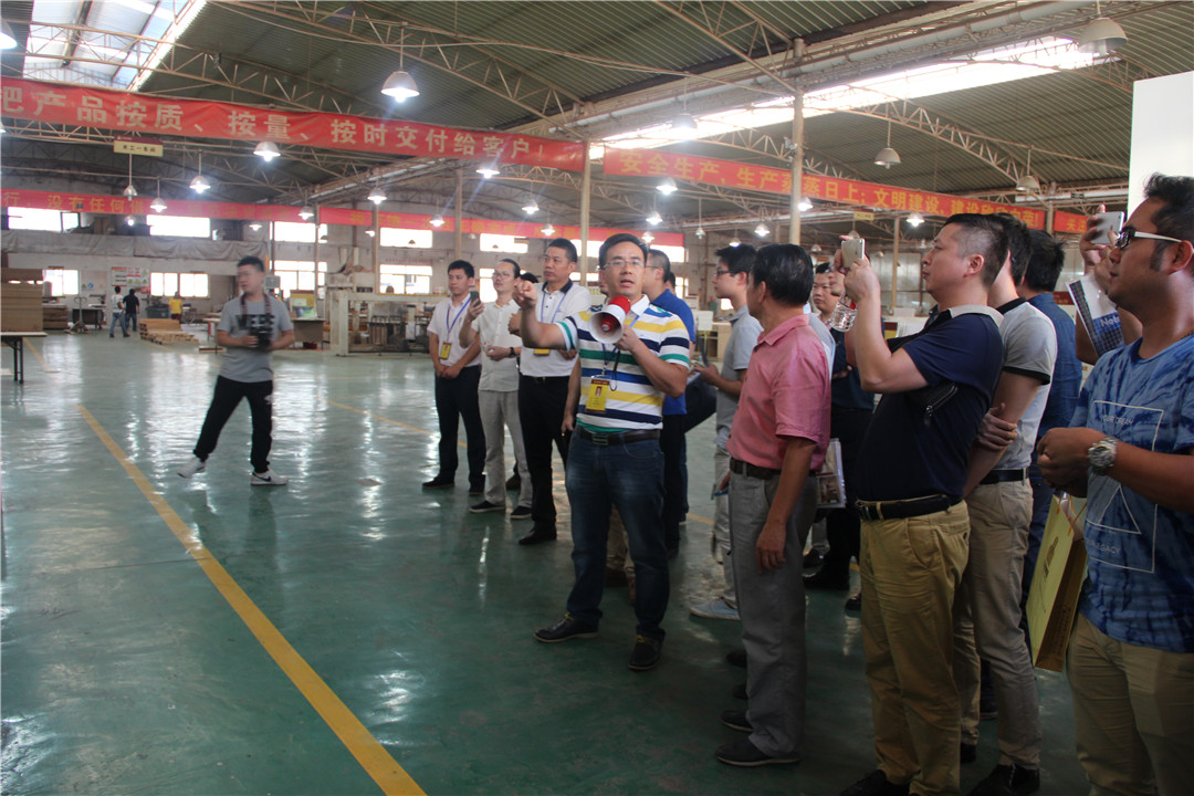 隨后,覃祖榮副總經(jīng)理帶領(lǐng)與會人員參觀了華輝集團(tuán)的固裝家具產(chǎn)品展示,介紹了相關(guān)產(chǎn)品,并帶領(lǐng)大家到集團(tuán)公司的生產(chǎn)車間現(xiàn)場,參觀工廠的流水線生產(chǎn)情況,了解更多的工廠管理模式及產(chǎn)品質(zhì)量控制等。