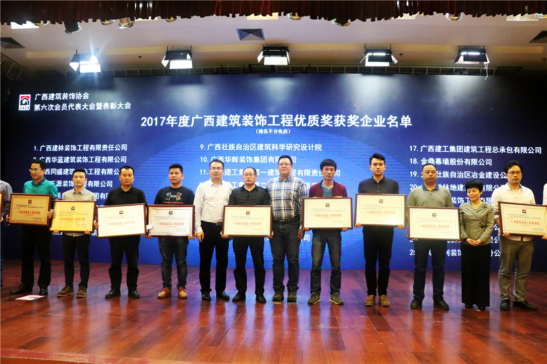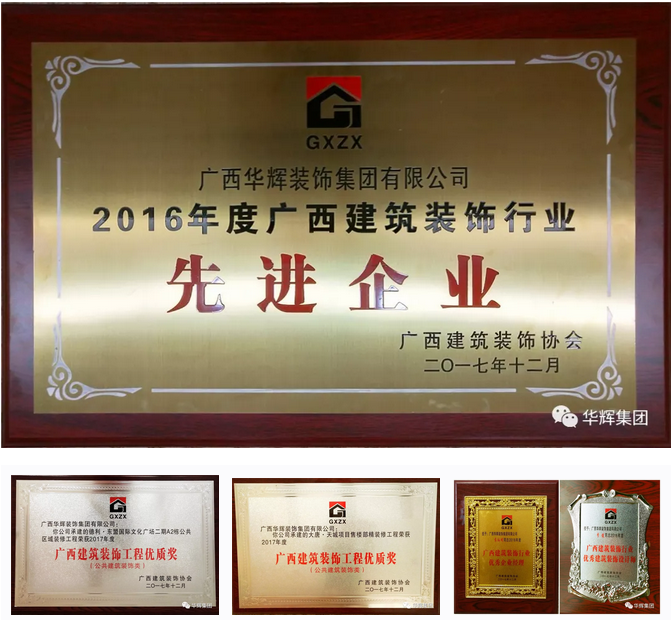 會議上還舉行了隆重的頒獎儀式,華輝裝飾集團喜獲多個獎項:華輝承建的德利·東盟國際文化廣場裝修工程、大唐·天城項目售樓部裝修工程榮獲2017年度廣西建筑裝飾工程優(yōu)質(zhì)獎(公共建筑裝飾類)”,“2016年度廣西建筑裝飾行業(yè)先進企業(yè)”,“2016年度廣西建筑裝飾行業(yè)優(yōu)秀企業(yè)經(jīng)理”及“2016年度廣西建筑裝飾行業(yè)優(yōu)秀建筑裝飾設(shè)計師”榮譽稱號。