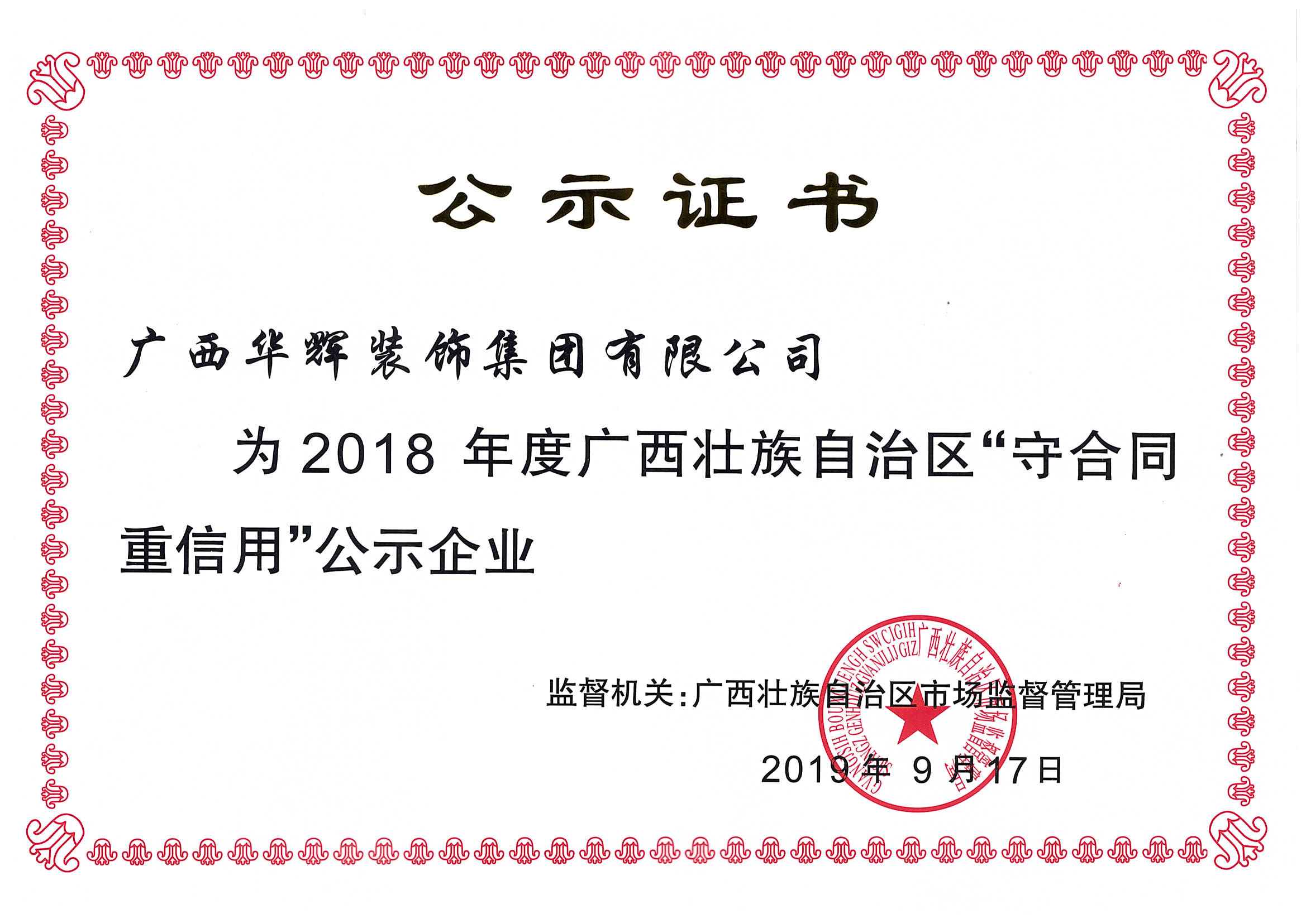 近日,在廣西壯族自治區(qū)市場監(jiān)督管理局開展的“守合同重信用”企業(yè)評選活動中,華輝憑借自身良好的信用體系建設(shè)、誠信守約形象,榮獲2018年度廣西壯族自治區(qū)“守合同重信用”企業(yè)。