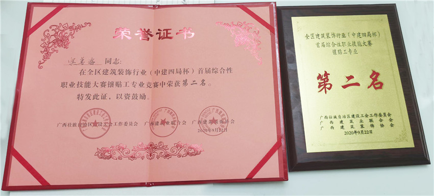 經過激烈的比賽角逐,華輝裝飾集團代表隊的兩名選手賓善海、賓善龍,憑借著深厚的技術素養(yǎng)、穩(wěn)定的賽場發(fā)揮,榮獲鑲貼工比賽亞軍;代表隊榮獲團體獎第六名。