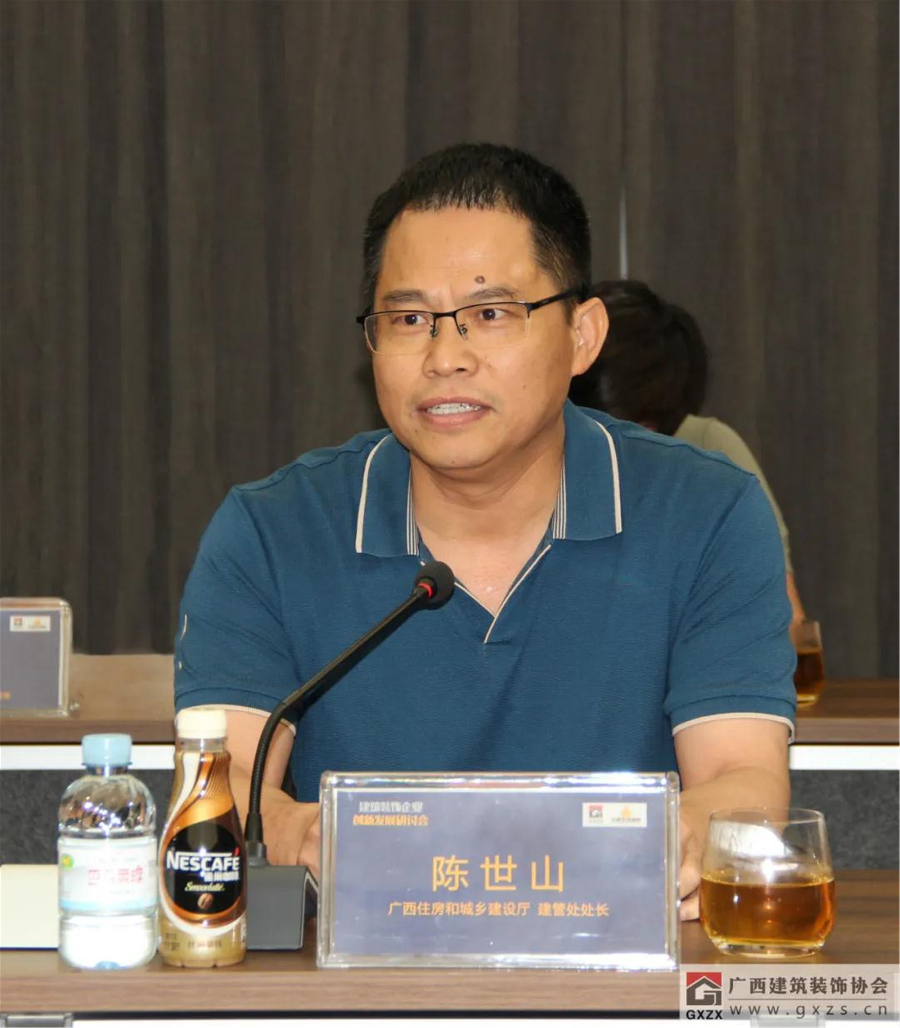 廣西住房和城鄉(xiāng)建設(shè)廳建筑市場(chǎng)監(jiān)管處處長(zhǎng)陳世山應(yīng)邀出席會(huì)議并做指導(dǎo)講話(huà)。他在講話(huà)中表示,很高興能夠參加這次研討會(huì),會(huì)議的主題與建筑裝飾行業(yè)發(fā)展的現(xiàn)狀很契合,找準(zhǔn)了行業(yè)發(fā)展面臨的主要問(wèn)題以及今后發(fā)展的方向。他談到,去年廣西建筑業(yè)稅收占比為10.3%,凸顯了建筑業(yè)在廣西經(jīng)濟(jì)發(fā)展中的地位越來(lái)越重要,自治區(qū)黨委、政府對(duì)建筑業(yè)發(fā)展給予高度重視,不久前專(zhuān)門(mén)召開(kāi)廳際聯(lián)席會(huì)以及全區(qū)建筑業(yè)高質(zhì)量發(fā)展大會(huì),研究建筑業(yè)高質(zhì)量發(fā)展問(wèn)題以及相關(guān)扶持政策。裝飾裝修行業(yè)作為建筑業(yè)的一個(gè)組成部分,是一項(xiàng)非常有意義的事業(yè),按照去年的統(tǒng)計(jì)數(shù)據(jù),裝飾業(yè)產(chǎn)值在廣西建筑業(yè)產(chǎn)值中所占的比例較小,說(shuō)明還具有較大的發(fā)展空間,希望廣西建筑裝飾企業(yè)在廣西建筑裝飾協(xié)會(huì)的帶領(lǐng)下,對(duì)自身工作多宣傳,樹(shù)立裝飾裝修行業(yè)在社會(huì)公眾中的新形象,促進(jìn)行業(yè)健康發(fā)展,達(dá)到各方多贏的局面。廣西建筑裝飾協(xié)會(huì)作為行業(yè)協(xié)會(huì),要多了解企業(yè)情況,積極向政府部門(mén)反饋企業(yè)面臨的,需要解決的問(wèn)題,爭(zhēng)取相關(guān)的政策支持,同時(shí)也要組織會(huì)員企業(yè)走出去,向先進(jìn)地區(qū)的優(yōu)秀企業(yè)學(xué)習(xí)取經(jīng),幫助本土企業(yè)的發(fā)展壯大。協(xié)會(huì)在這方面做了一定的工作,去年組織的深圳頭部裝飾企業(yè)與廣西頭部裝飾企業(yè)結(jié)對(duì)子的活動(dòng),就是一個(gè)很好的嘗試。廣西住建廳也準(zhǔn)備在國(guó)內(nèi)5個(gè)城市建立服務(wù)點(diǎn),協(xié)調(diào)當(dāng)?shù)叵嚓P(guān)政府部門(mén),為廣西企業(yè)走出去提供助力。同時(shí),也鼓勵(lì)外省優(yōu)秀企業(yè)進(jìn)入廣西市場(chǎng),參與廣西建設(shè)。希望廣西的頭部裝飾企業(yè)發(fā)揮自己的影響力,體現(xiàn)自身價(jià)值,促進(jìn)廣西建筑裝飾行業(yè)高質(zhì)量發(fā)展。