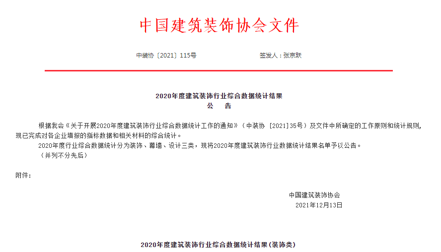 “中國建筑裝飾行業(yè)綜合數(shù)據(jù)統(tǒng)計工作”是由中國建筑裝飾協(xié)會主辦,采用市場評價的方式,通過嚴格審查參評企業(yè)年度的各項數(shù)據(jù),測評企業(yè)財務年度指標、質量技術指標、人力資源指標,企業(yè)年度各類工程的獲獎情況,專利情況,嚴格參照國家標準、行業(yè)標準、地方標準進行層層測評,分為裝飾類、幕墻類、設計類三項,受到業(yè)界的廣泛認可。