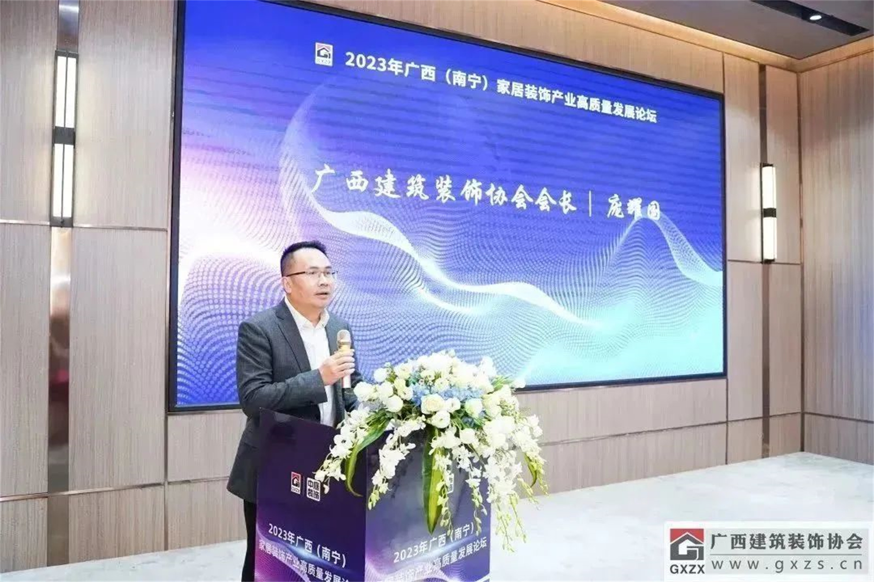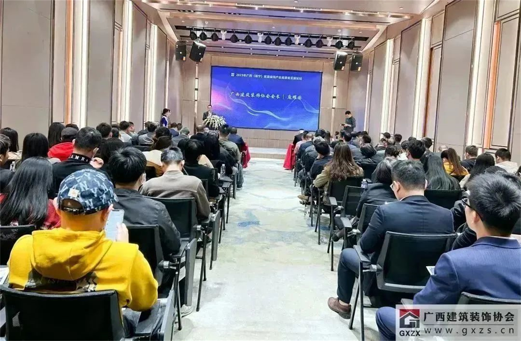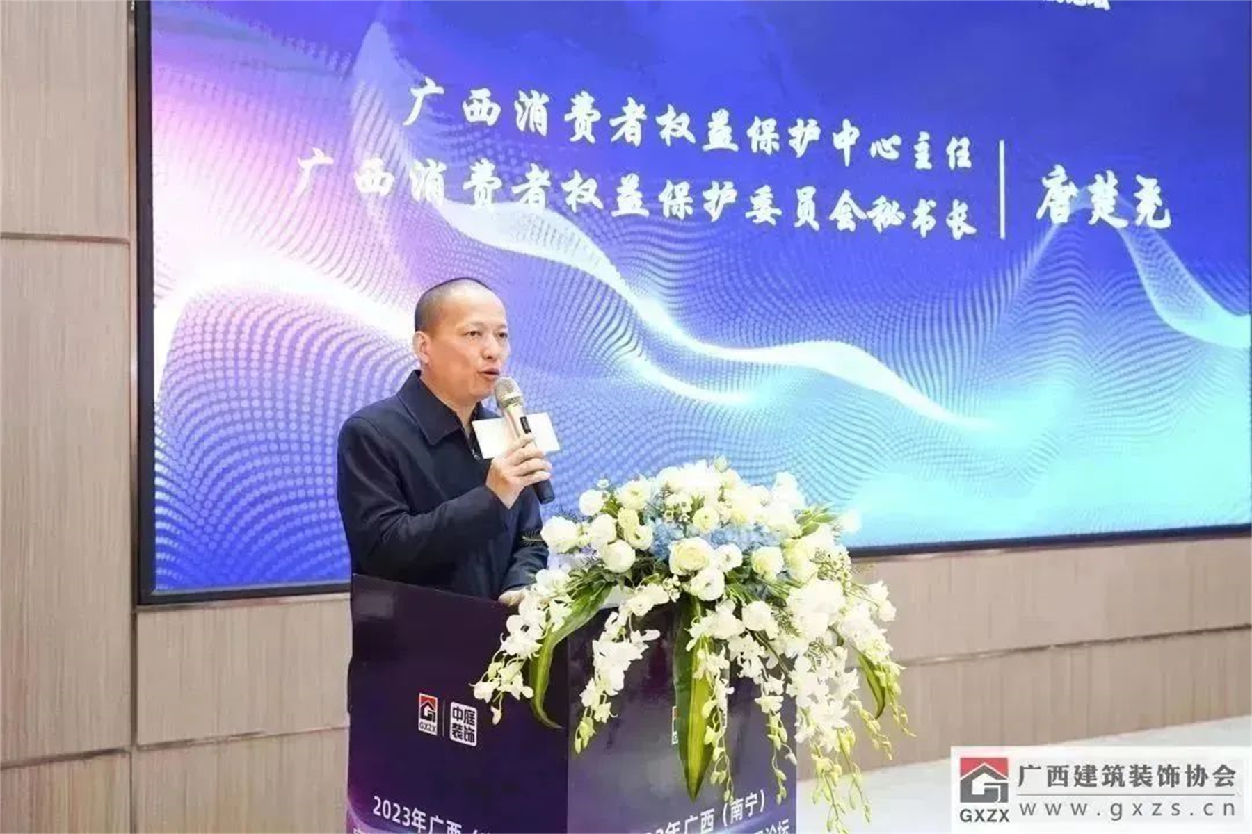 2023年2月27日,由廣西建筑裝飾協(xié)會主辦的,2023年廣西(南寧)家居裝飾產(chǎn)業(yè)高質(zhì)量發(fā)展論壇在南寧成功舉辦。廣西消費者權(quán)益保護中心主任、廣西消費者權(quán)益保護委員會秘書長唐楚堯、廣西消費者權(quán)益保護中心(廣西消費者權(quán)益保護委員會秘書處)消費指導(dǎo)與質(zhì)量監(jiān)督部主任李競瑩受邀出席活動。協(xié)會會長龐耀國、副會長楊景忠、謝嘉、秘書長譚謙、廣西頭部住宅裝修企業(yè)負(fù)責(zé)人、來自協(xié)會約30家會員企業(yè)的代表等共100余人參加會議。