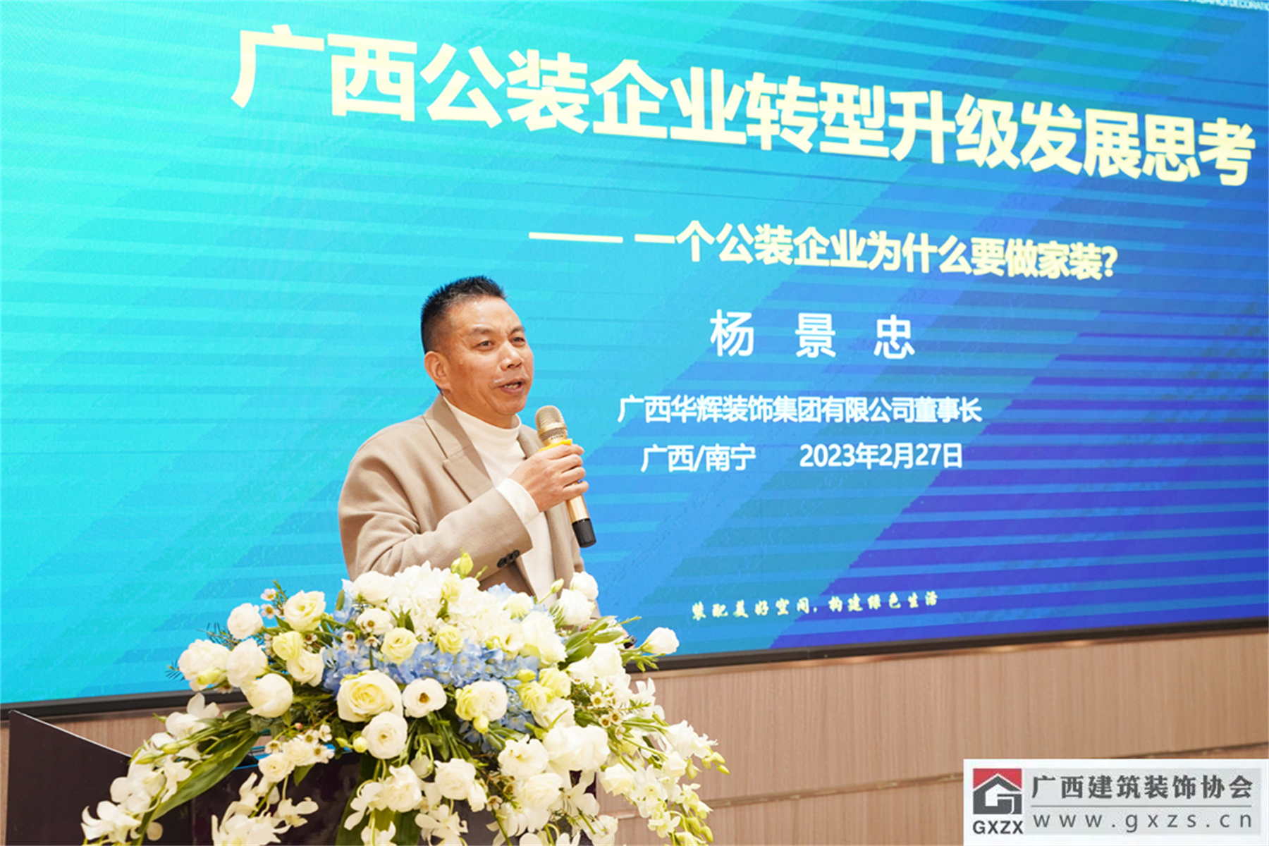 楊景忠作了《廣西公裝企業(yè)轉(zhuǎn)型升級發(fā)展思考》的分享,指出:2022年,華輝拓展了別墅奢裝新賽道,開啟公裝、家裝雙軌道運營模式。2021年,華輝做了充分的市場調(diào)研,發(fā)現(xiàn)了家裝行業(yè)的四大痛點,結(jié)合華輝的優(yōu)勢:專做五星級酒店、專做五A級寫字樓、專做大型公共建筑,華輝的最終定位為家裝領(lǐng)域的高檔客戶,由華輝別墅奢裝公司運營。華輝別墅奢裝將為客戶帶來4大“確定性”。