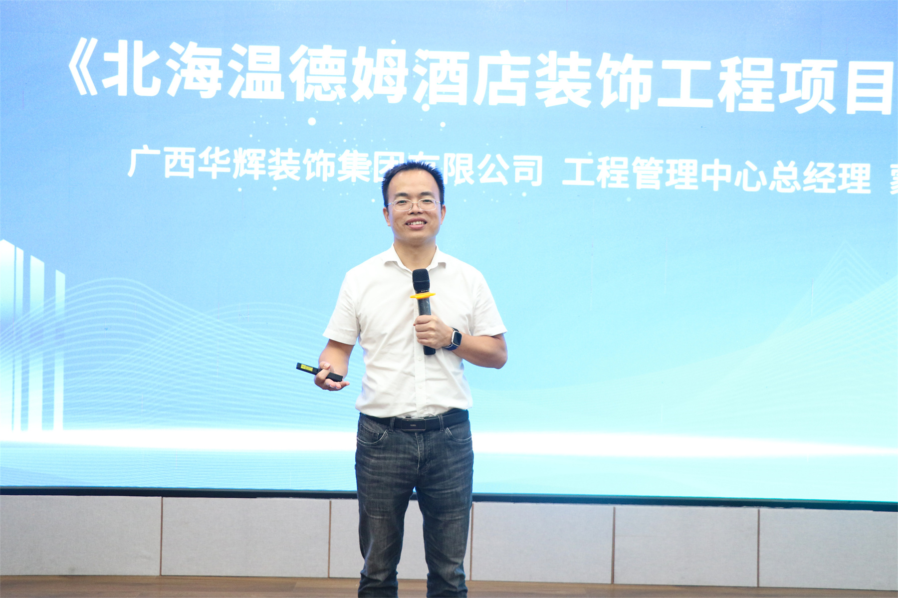 ▲華輝裝飾工程管理中心總經(jīng)理蒙健生作主題為“北海溫德姆酒店裝飾工程”的項目分享